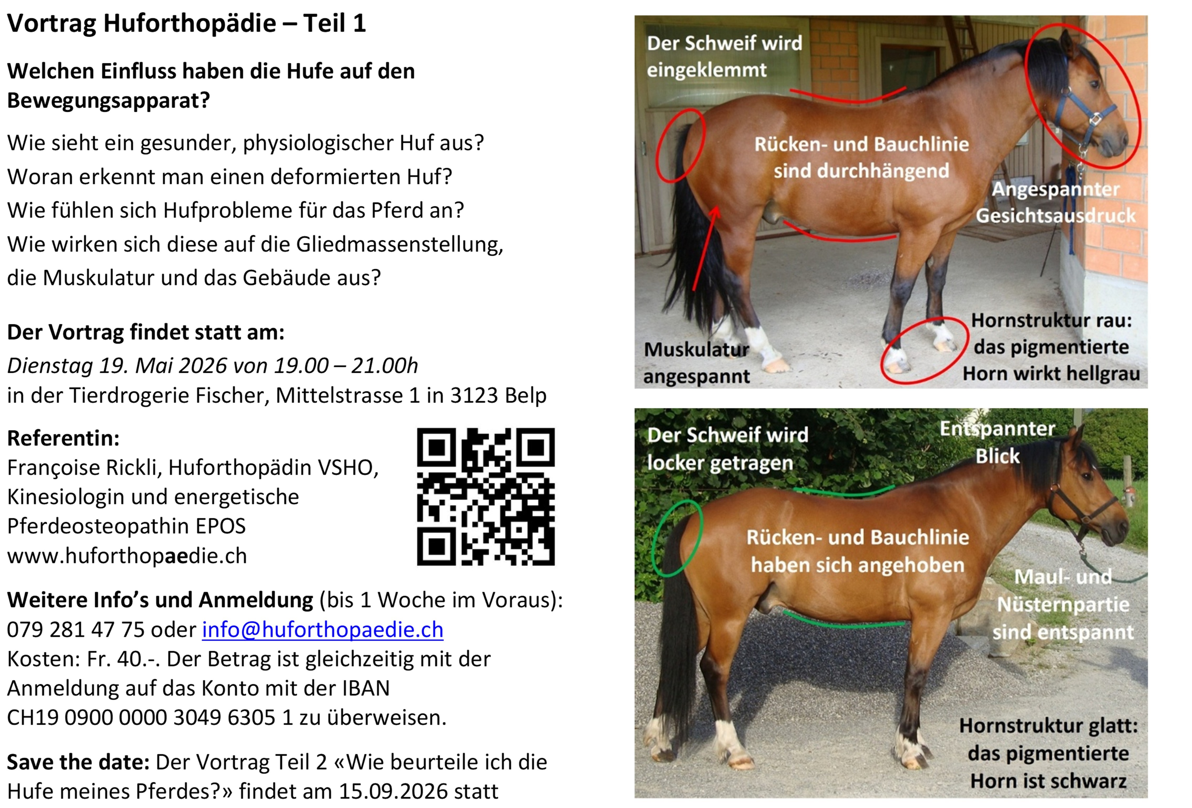 Beide Vorträge beinhaltet zahlreiche Fotobeispiele und einzigartige Fallpräsentationen aus der Praxis von Françoise Rickli. Die Vorträge richten sich an Pferdebesitzer/innen, Reitbeteiligungen, Pferdetrainer/innen, Therapeuten/innen, Veterinärstudenten/innen und pferdeinteressierte Personen. Vorkenntnisse sind keine notwendig. Die Vorträge finden von 19.00 – 21.00h in der Tierdrogerie Fischer, Mittelstrasse 1 in 3123 Belp statt. Die Anmeldung erfolgt per Mail an
